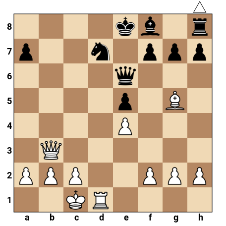 La tour blanche joue en d8 échec et mat. Protégée par le fou g5, la tour contrôle la huitième rangée et coupe toute fuite au roi noir. Le roi noir ne peut ni capturer la tour (le fou g5 la défend), ni interposer une pièce, ni s’échapper sur une autre case, car toutes les cases de fuite sont contrôlées par les pièces blanches. La position noire est totalement paralysée : c’est le mat final annoncé.