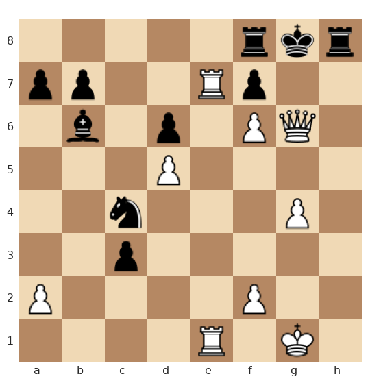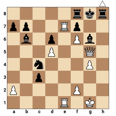 Les Blancs ont une attaque massive contre le roi noir, coincé sur la colonne g avec peu de cases de fuite. La dame blanche, déjà très active, peut sacrifier matériellement pour ouvrir définitivement la position autour du roi adverse. Les pièces noires sont mal coordonnées et le roi noir est aligné avec sa tour et son fou, ce qui rend la case g7 particulièrement vulnérable. Les Blancs jouent et peuvent forcer un mat en deux coups grâce à une combinaison précise.