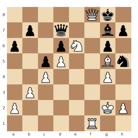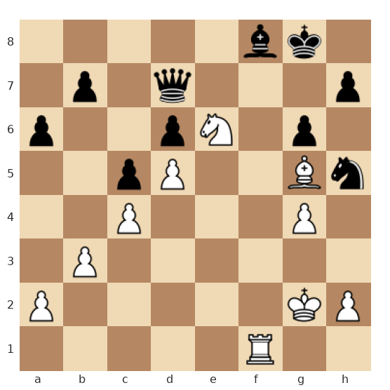 Les Blancs ont une dame en f2, une tour en f1 et un fou très actif en g5 qui cible les cases noires autour du roi noir en g8. Le roi noir est relativement exposé, coincé sur la colonne g avec peu de cases de fuite, et la tour noire en f8 est la principale pièce défensive. C’est aux Blancs de jouer, et ils disposent d’un sacrifice spectaculaire de dame pour forcer un mat en seulement deux coups.