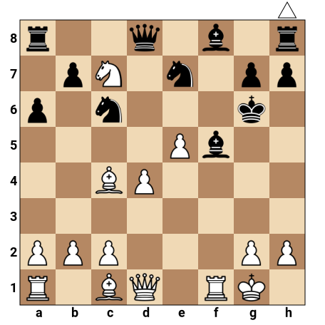 Les Blancs ont leurs pièces idéalement coordonnées autour du roi noir affaibli : le fou noir f8 et le cavalier e7 sont mal placés pour défendre, et les cases autour du roi noir sont fragiles. En exploitant la diagonale vers g4 et la faiblesse des cases noires autour du roi, les Blancs disposent d’une combinaison forcée menant au mat en deux coups.
