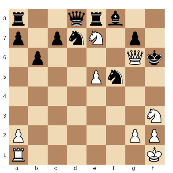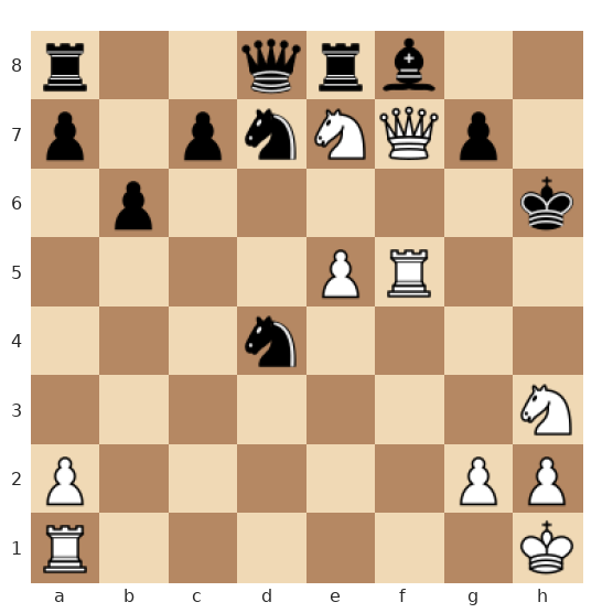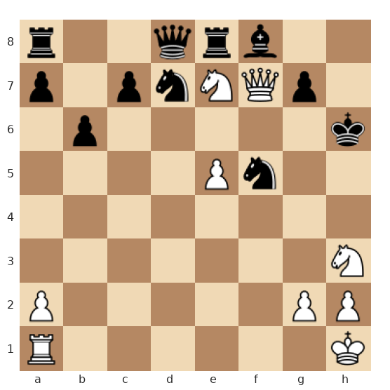 Les Blancs ont la dame très active en f7, deux cavaliers agressifs en g6 et h3, et une tour en e5 pointée vers le roi noir. Le roi noir est coincé au centre, ses pièces sont mal coordonnées et la dame noire défend des cases clés autour de son roi. C’est au tour des Blancs de jouer et ils disposent d’une combinaison forcée menant au mat en deux coups, s’ils exploitent correctement la faiblesse des cases autour du roi noir et les motifs de clouage.