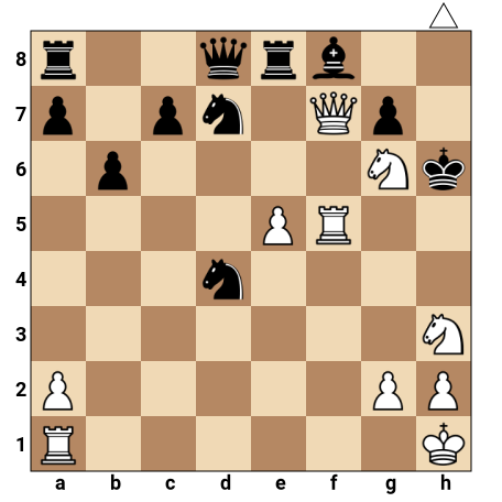 Les Blancs ont la dame très active en f7, deux cavaliers agressifs en g6 et h3, et une tour en e5 pointée vers le roi noir. Le roi noir est coincé au centre, ses pièces sont mal coordonnées et la dame noire défend des cases clés autour de son roi. C’est au tour des Blancs de jouer et ils disposent d’une combinaison forcée menant au mat en deux coups, s’ils exploitent correctement la faiblesse des cases autour du roi noir et les motifs de clouage.