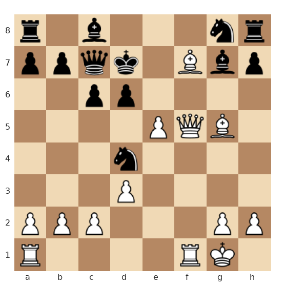 Les Blancs ont roi en g1, dame en f2, tours a1 et f1, fou g5 très actif attaquant la tour d8 et fou f7 clouant le roi noir en d7. Les Noirs ont le roi en d7, la dame en c7, les tours en a8 et d8, un fou en g7, un cavalier en d4 et un cavalier en g8, avec une structure de pions compacte autour du roi. C’est au tour des Blancs de jouer et ils disposent d’une combinaison directe pour mater le roi noir au centre en deux coups seulement.