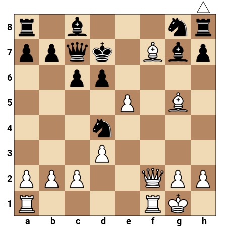 Les Blancs ont roi en g1, dame en f2, tours a1 et f1, fou g5 très actif attaquant la tour d8 et fou f7 clouant le roi noir en d7. Les Noirs ont le roi en d7, la dame en c7, les tours en a8 et d8, un fou en g7, un cavalier en d4 et un cavalier en g8, avec une structure de pions compacte autour du roi. C’est au tour des Blancs de jouer et ils disposent d’une combinaison directe pour mater le roi noir au centre en deux coups seulement.