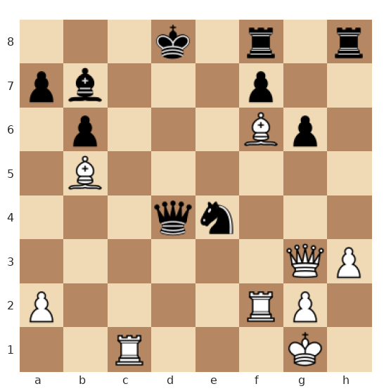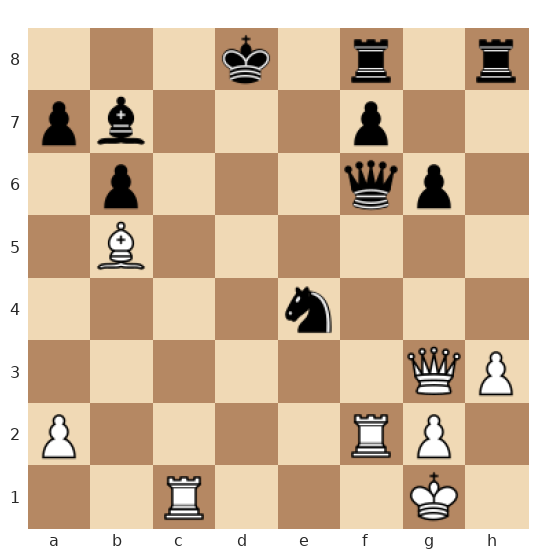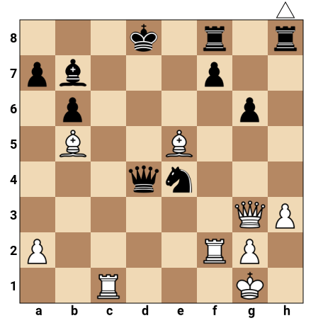 Les Blancs ont une attaque puissante contre le roi noir au centre du plateau. La tour blanche en g2, la dame en g3 et le fou en b5 ciblent les cases autour du roi noir en d8. Le fou en e5 est également prêt à intervenir. Le roi noir est en d8, avec peu de cases de fuite, et les pièces noires sont mal coordonnées : la dame noire en d4, la tour en f8 et les pions autour du roi ne suffisent pas à le protéger. C’est au tour des Blancs de jouer et de trouver une combinaison décisive menant au mat en deux coups.