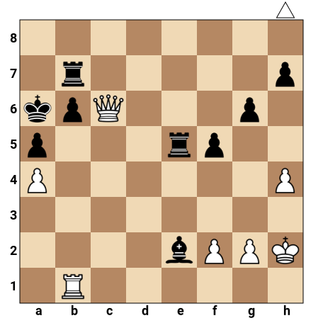 Les Blancs ont une dame très active en c6, une tour sur b1 et un roi en sécurité sur h2. Les Noirs ont leur roi sur a6, une tour sur b7, une autre tour sur e5 et une dame absente, avec des faiblesses autour du roi. C’est au tour des Blancs de jouer et de trouver une combinaison gagnante permettant de mater rapidement le roi noir.