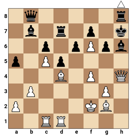 Les Blancs ont leur dame en h4, un fou puissant en d4, une tour sur c1 et une autre sur d1, avec le roi en f2. Les Noirs ont le roi en h7, une dame active en b8, un fou dangereux en g6 et plusieurs pièces pointant vers le roi blanc. C’est au tour des Blancs, qui peuvent exploiter la faiblesse du roi noir, déjà exposé sur la colonne h, pour forcer un mat rapide grâce à un sacrifice décisif.