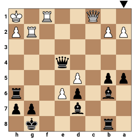 Les Noirs viennent de jouer et ont une attaque massive contre le roi blanc réfugié en h1. La tour noire en h6 et la dame en e4 ciblent déjà l’aile roi. Le fou noir en b6 et l’autre fou en d7 contrôlent de longues diagonales, tandis que les pions noirs avancés sur a5 et b5 limitent les fuites possibles du roi blanc. Les Blancs, eux, ont un roi exposé avec très peu de pièces autour pour le défendre : une tour en g2, une tour en f1 et une dame en c1, mais aucune ne protège efficacement les cases noires autour du roi. Dans cette configuration, les Noirs disposent d’un sacrifice décisif qui ouvre la dernière ligne de défense du roi blanc et conduit à un mat forcé en deux coups.