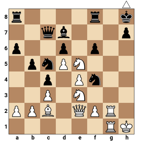 Les Blancs ont une forte attaque contre le roi noir coincé en h8. Le fou noir en c7 et les pièces lourdes défensives semblent bien placés, mais la coordination des cavaliers blancs et de la tour sur la colonne g permet de lancer un sacrifice décisif pour ouvrir les lignes autour du roi.