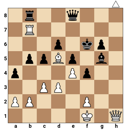 Les Blancs ont la dame en h1, une tour en b7, un fou actif en d5 et le roi en f1. Le roi noir est en f6, protégé par sa dame en e8, une tour en b8 et quelques pions autour. C est aux Blancs de jouer et ils disposent d un motif de mat en deux coups en exploitant la faiblesse des cases autour du roi noir et la coordination dame-tour.