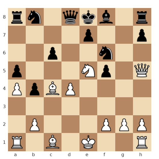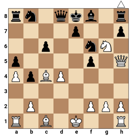 Les Blancs ont une attaque écrasante autour du roi noir encore au centre. Le cavalier blanc en g6 est très avancé et regarde les cases clés autour du roi, tandis que la dame blanche en h5 et le fou de c4 pointent déjà vers le roque noir. Les pièces noires sont mal coordonnées et le roi noir manque de cases de fuite : c’est le moment de conclure par un mat forcé en deux coups.