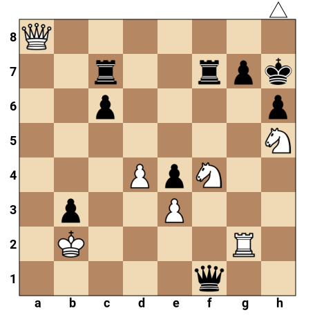 Les Blancs, conduits par Petrosian, ont leurs pièces très actives autour du roi noir. La dame blanche est en a8, les cavaliers dominent les cases clés, et la tour blanche sur g2 vise déjà l’aile roi. Le roi noir, affaibli, est exposé près de la colonne g, avec peu de cases de fuite et une structure de pions endommagée. C’est au tour des Blancs de jouer et de conclure par un mat forcé en deux coups.