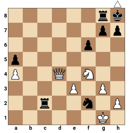 Les Blancs ont la dame en d4, un cavalier en f4 et des pièces bien placées autour du roi noir en g8. Le roi noir est exposé sur la colonne g avec un pion en g7 et un pion h7, tandis que les pièces noires sont mal coordonnées. C est aux Blancs de jouer et ils disposent d une combinaison forcée pour mater le roi noir en deux coups.