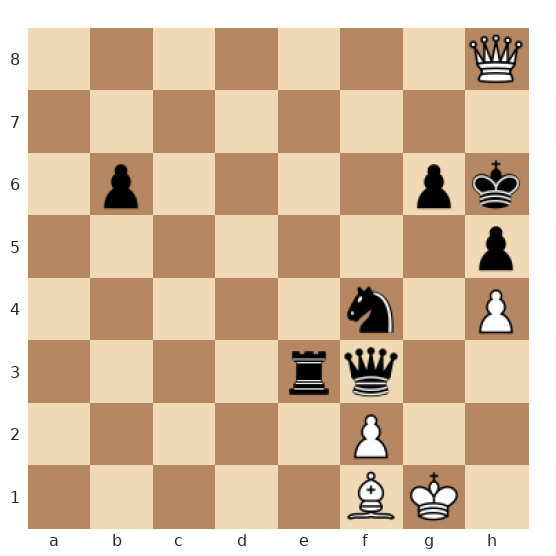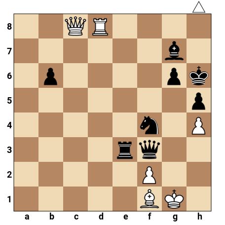 Les Blancs ont dame en c8, tour en d8 et fou en f1, avec un roi en g1. Les Noirs ont un roi affaibli en h6, un fou dangereux en g7 et une dame active sur e3. Malgré l’activité des pièces noires et la pression sur le roi blanc, la tour blanche peut lancer un sacrifice décisif sur la huitième rangée pour ouvrir une case de mat à la dame.