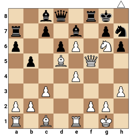 Les Blancs ont une forte attaque contre le roi noir roqué côté roi. La dame blanche est déjà agressivement placée en f5, le fou de la case d5 pointe vers le roi noir et le pion e6 est très avancé, à une case de la promotion. Les pièces noires sont mal coordonnées et le roi noir manque de cases de fuite. C’est au tour des Blancs de jouer et ils disposent d’une combinaison décisive menant au mat en 2 coups.