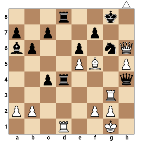 Les Blancs ont leur dame en h6, une tour sur g3 et une autre sur d1, prêtes à attaquer le roi noir sur g8. Les Noirs ont un roi affaibli, peu de cases de fuite et leurs pièces lourdes sont mal coordonnées. C’est aux Blancs de jouer et ils disposent d’un enchaînement forcé qui conduit au mat en deux coups, même si les Noirs répondent de la meilleure façon.