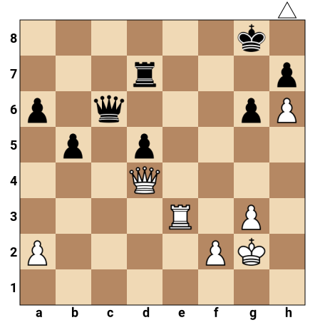 Les Blancs ont une dame active en d4, une tour en e3 et un pion h6 très avancé qui étouffe le roi noir en g8. Les Noirs ont leur dame en c6, une tour en d7 et quelques pions, mais leur roi manque cruellement de cases de fuite. C’est au tour des Blancs de jouer et ils disposent d’une combinaison directe pour mater en deux coups.