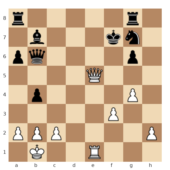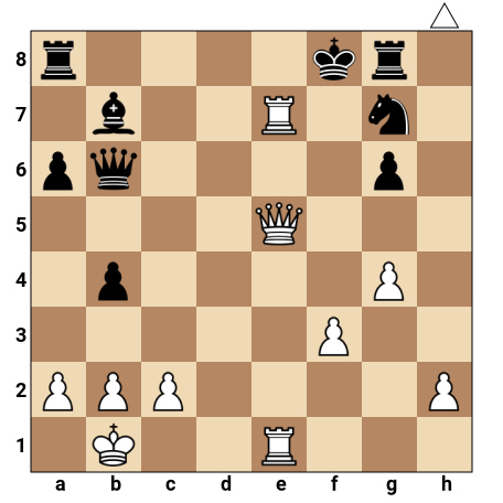 Les Blancs ont la dame en e5, une tour en e1 et une autre en e7, avec le roi en b1. Les Noirs ont le roi en f8, la dame en b6, une tour en a8, un fou en b7 et des pièces autour de leur roi qui semblent le protéger. Pourtant, la dame blanche et la tour en e7 sont parfaitement coordonnées pour lancer une attaque décisive sur le roi noir, presque enfermé sur la 8e rangée.