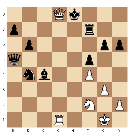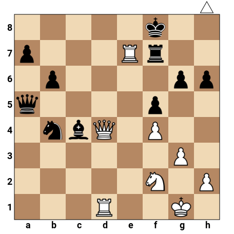 Les Blancs ont la main dans une position très agressive : leur dame est centrale sur d4, une tour blanche active sur la colonne d et l’autre prête à s’infiltrer sur la 7e rangée, tandis que le roi noir est exposé sur la 8e rangée avec peu de cases sûres. Les pièces noires, bien que materiallement correctes, sont mal coordonnées et laissent leur roi vulnérable à un motif de mat forcé.