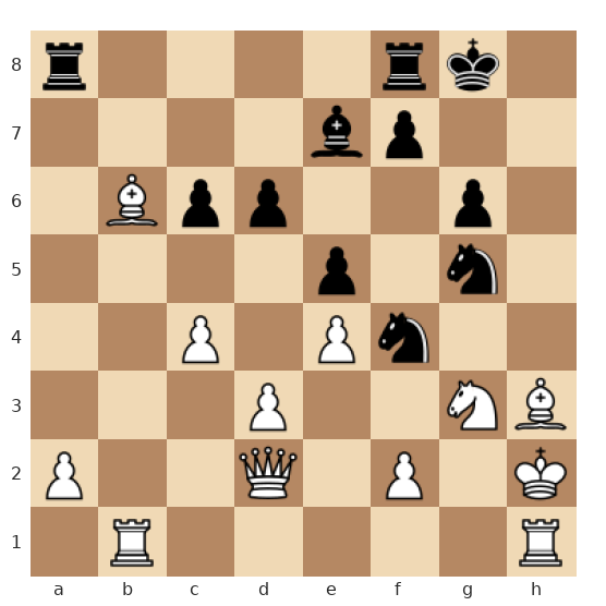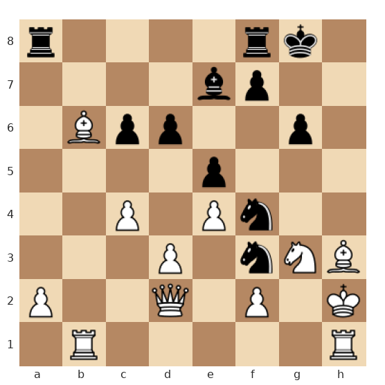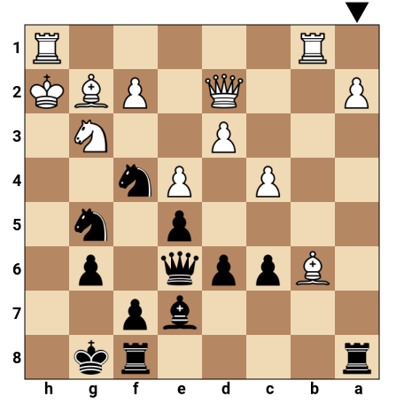 Dans cette position issue d’une partie réelle, le roi noir est en sécurité derrière son roque tandis que le roi blanc, réfugié en h2, est entouré de pièces mais manque cruellement de cases de fuite. La dame noire, déjà centralisée, peut rapidement se projeter vers l’aile-roi. Les pièces lourdes blanches sont loin de leur roi et leurs pièces mineures sont mal coordonnées pour le défendre. Les Noirs disposent d’un fort potentiel d’attaque contre le roi blanc, notamment grâce à la coordination de la dame, du cavalier et du fou.
