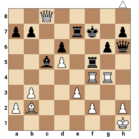 Les Blancs ont une forte attaque contre le roi noir roqué à l’aile roi. Les tours blanches sont alignées sur la colonne f et la rangée g, tandis que la dame blanche est prête à rejoindre l’attaque depuis c8. Le pion noir g6 et la tour noire f7 défendent le roi, mais les Blancs peuvent ouvrir les lignes décisives contre le roi noir grâce à un sacrifice de tour sur f5, suivi d’un mat avec la dame sur la première rangée noire.