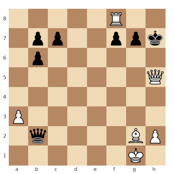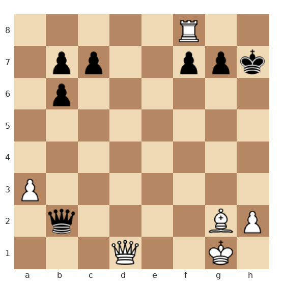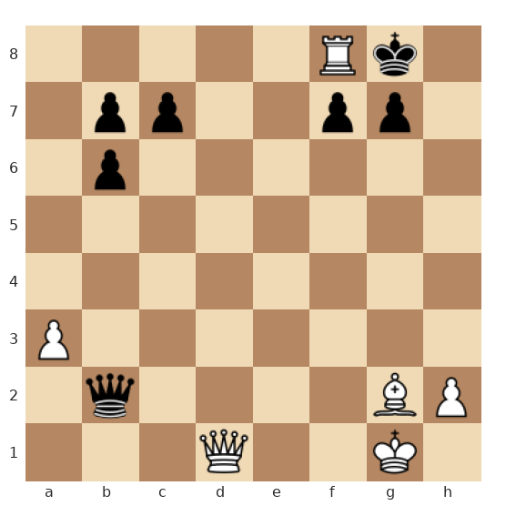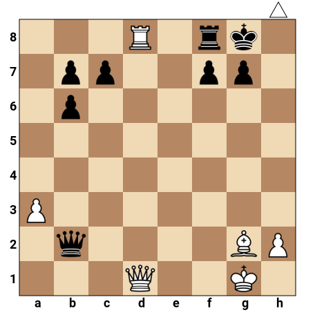 Les Blancs ont une tour en d8 prête à attaquer, la dame en d1, un pion solide en a3 et un fou dangereux en g2. Le roi blanc est en g1, en sécurité. Les Noirs ont leur roi en g8, la tour en f8, la dame en b2 et quelques pions autour, mais leurs pièces lourdes sont mal coordonnées. C’est au tour des Blancs de jouer et ils disposent d’une combinaison forcée menant au mat.