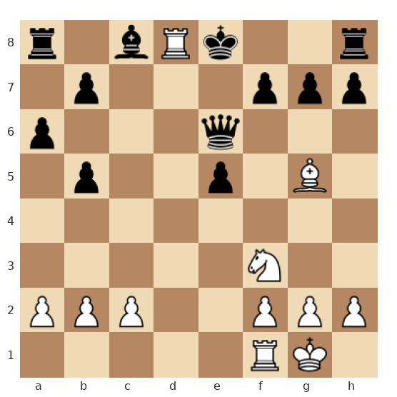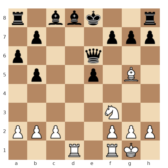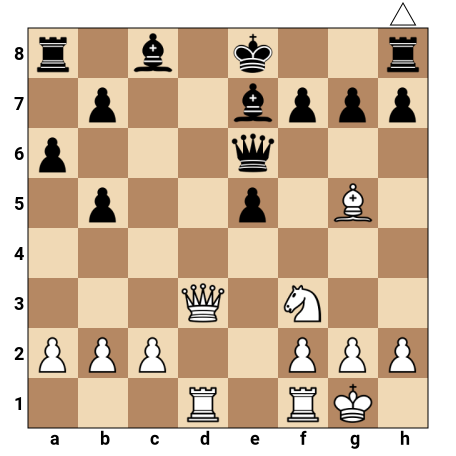 Les Blancs ont la Dame en d3, une Tour en d1 et un Fou actif en g5, tous braqués vers le roi noir resté au centre en e8. Les Noirs ont une Dame en e6 et un Fou en e7, mais leurs pièces sont mal coordonnées et le roi noir est vulnérable sur la colonne d. C’est aux Blancs de jouer et ils disposent d’une combinaison directe pour forcer le mat.