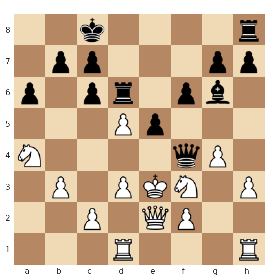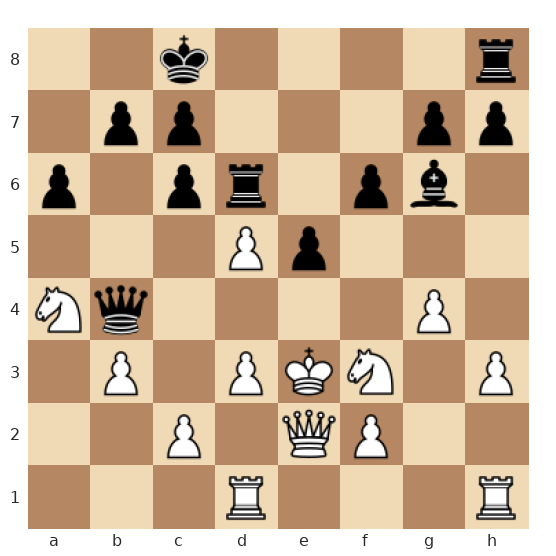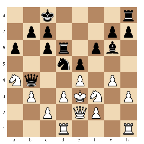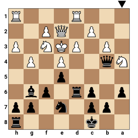 Les Noirs ont le trait dans une position très agressive : leurs pièces lourdes pointent déjà vers le roi blanc au centre (en e3), tandis que la dame noire est prête à rejoindre l’attaque. Le roi blanc, encore au centre, est vulnérable et manque de pions protecteurs devant lui, ce qui rend les motifs de mat rapides particulièrement dangereux.