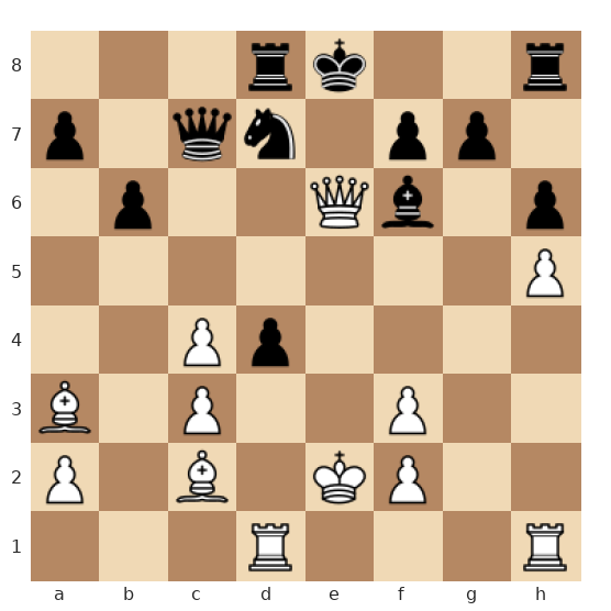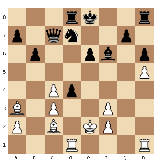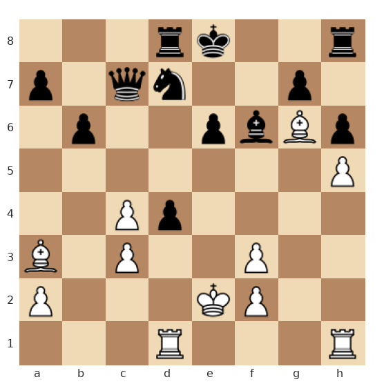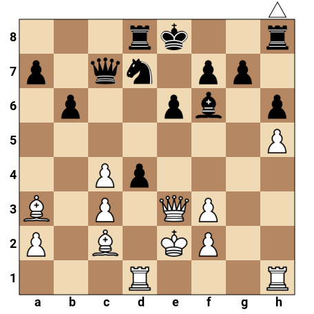 Les Blancs ont leur roi en e2, solidement protégé, et leurs pièces lourdes (dame en e3, tours en d1 et h1) prêtes à frapper sur le roi noir resté au centre en e8, coincé derrière un roque difficile à réaliser. L’alphabet des pièces blanches est complété par un fou puissant en c2 et un pion avancé en h5 qui gêne la sécurité du roi noir. Les Noirs ont un roi en e8, une tour en h8, des pièces mineures et des pions qui semblent solides, mais leur roi est vulnérable sur les cases sombres autour d’e7 et f7. Dans cette position tendue, les Blancs disposent d’une combinaison forcée qui mène au mat en deux coups.