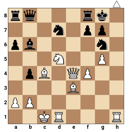 Les Blancs ont leurs pièces très actives : le cavalier est posté en d5 au cœur du camp adverse, la dame en e4 vise à la fois l’aile-roi et l’aile-dame, et les fous contrôlent de grandes diagonales. Le roi noir est relativement exposé sur g8, protégé par quelques pièces mais manquant d’espace. Dans cette position, les Blancs disposent d’une combinaison forcée qui mène au mat en deux coups, en exploitant un échec intermédiaire et une faiblesse ultime autour du roi noir.