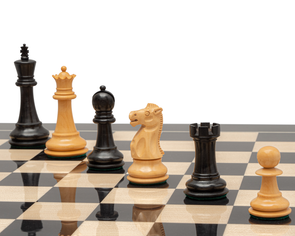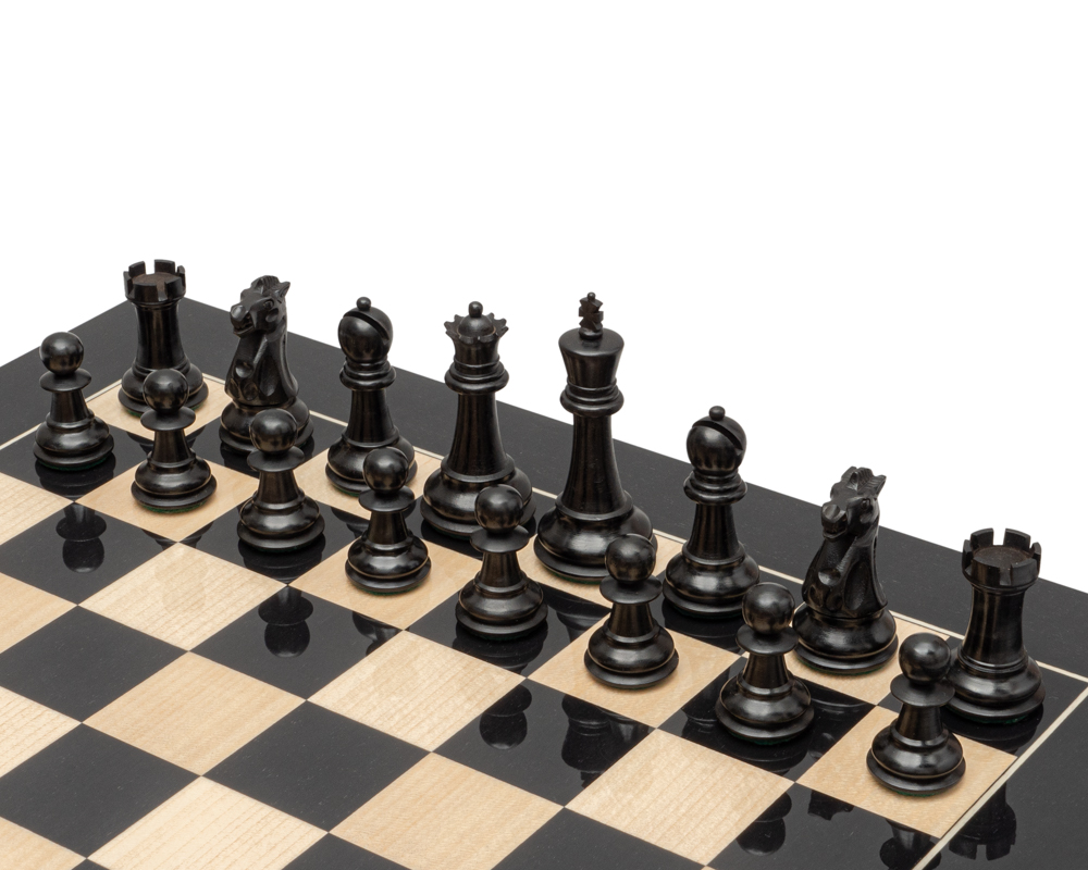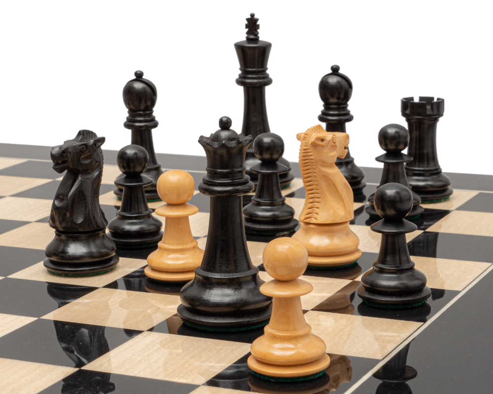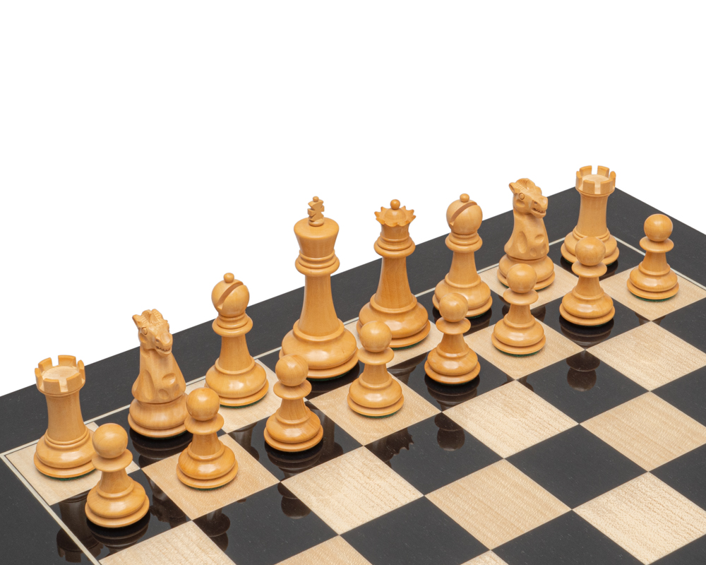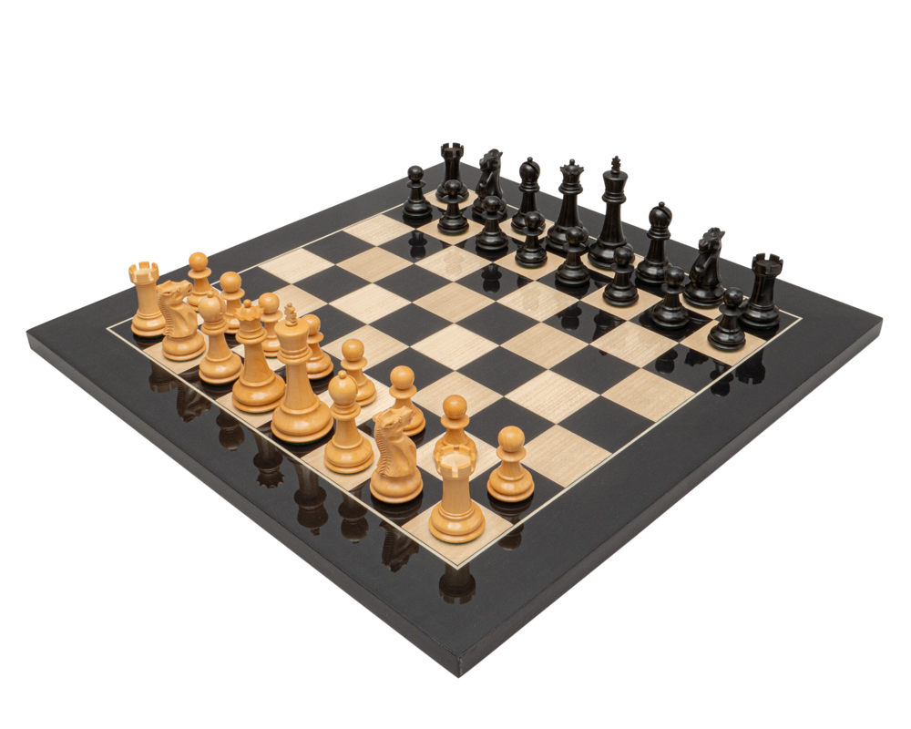 Jeu d’Échecs Staunton Noir et Blanc en Ébène et Buis avec Échiquier en Anegre Noir et Érable – Roi 8,9 cm