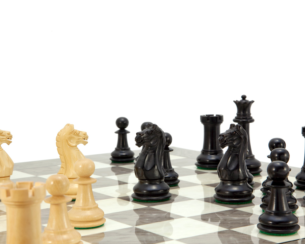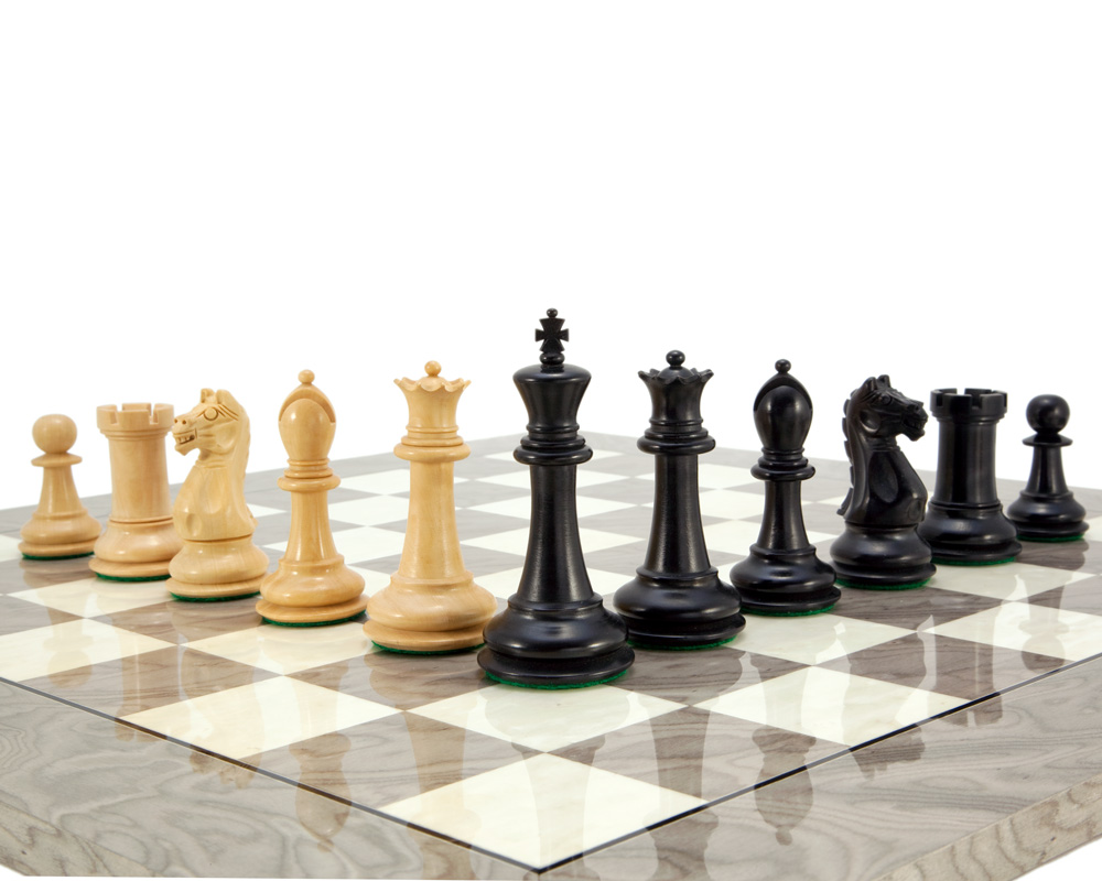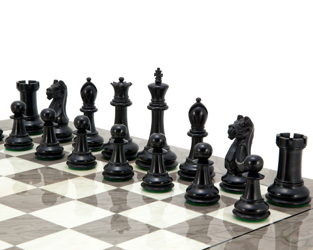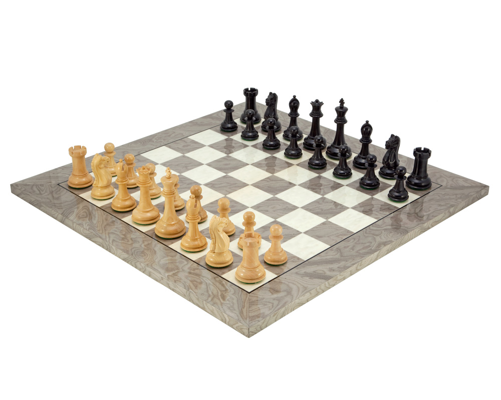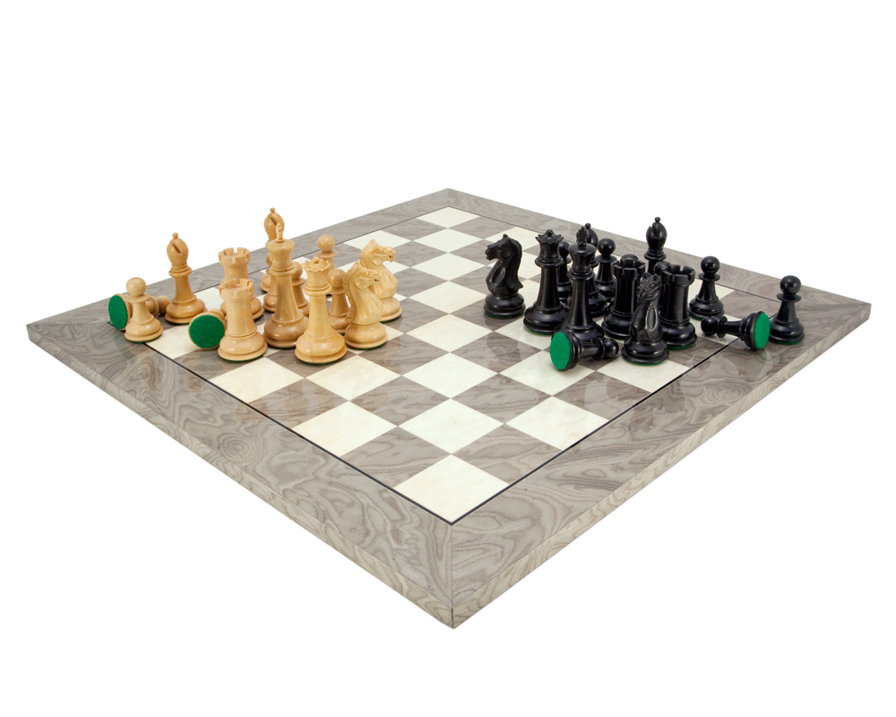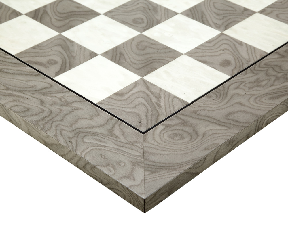 Ces magnifiques pièces en bois de buis et de buis ebonisé présentent un roi de 9,5 cm et ornent le plateau de 55 x 55 cm avec une échelle et des proportions parfaites. Elles complètent les teintes grises riches de ce plateau en bois de loupe de frêne dont la finition laquée brillante offre une profondeur et des motifs superbes.