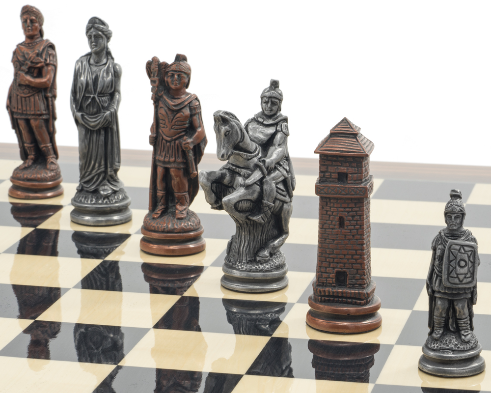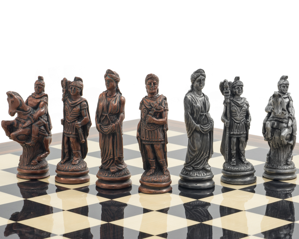 Jeu d’échecs de prestige inspiré de la Rome antique avec pièces en résine effet métal et pierre. Livré avec un échiquier en bois noir et palissandre haute brillance.
